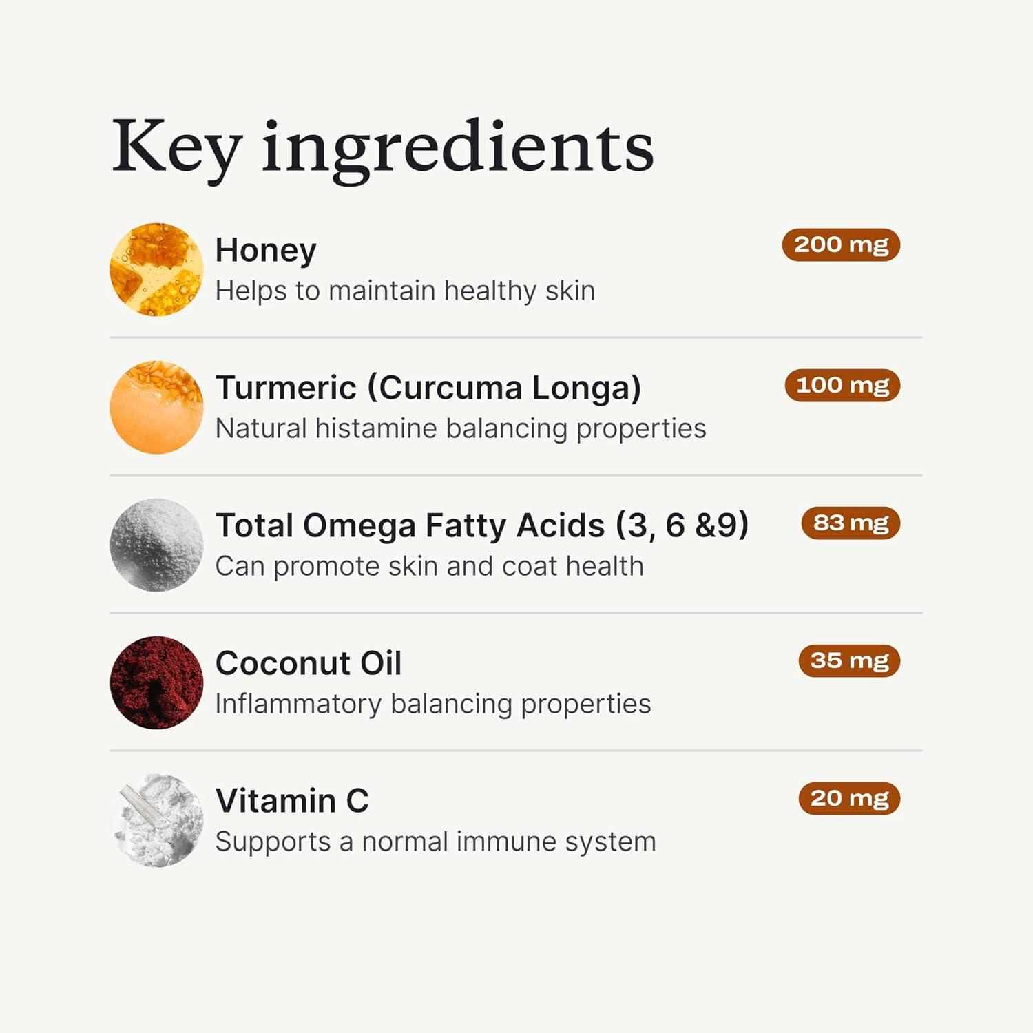 Coat Condition & Comfort – The expertly selected ingredients packed into each dog allergy chew can support seasonal shedding and help maintain your pup's moisturized, healthy skin & coat from the inside out